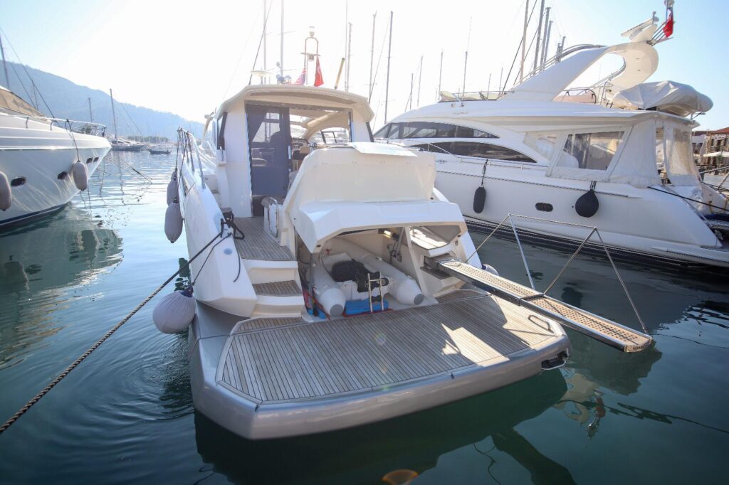 The Azimut Atlantis 50 features a fully equipped kitchen, bathroom with separate entrance, a unique skylight that can be opened to illuminate the entrance to the boat owner’s cabin and a retractable swim platform. The yacht is in excellent condition. It is propelled by twin 600 MHP (442 KW) CUMMINS QSC 8.3 V-Drive engines which deliver a maximum Speed of 32 Knots with a cruising speed of 28 Knots. 800 hours on each motor.