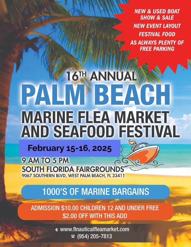 Under The Sun Promotions Inc. is pleased to announce that the Palm Beach Marine Flea Market and Seafood Festival is returning for its 14th year, taking place at the South Florida Fairgrounds 9067 Southern Blvd, West Palm Beach, Florida 33411 on Saturday and Sunday February 15-16, 2025. www.FLNauticalFleaMarket.com
