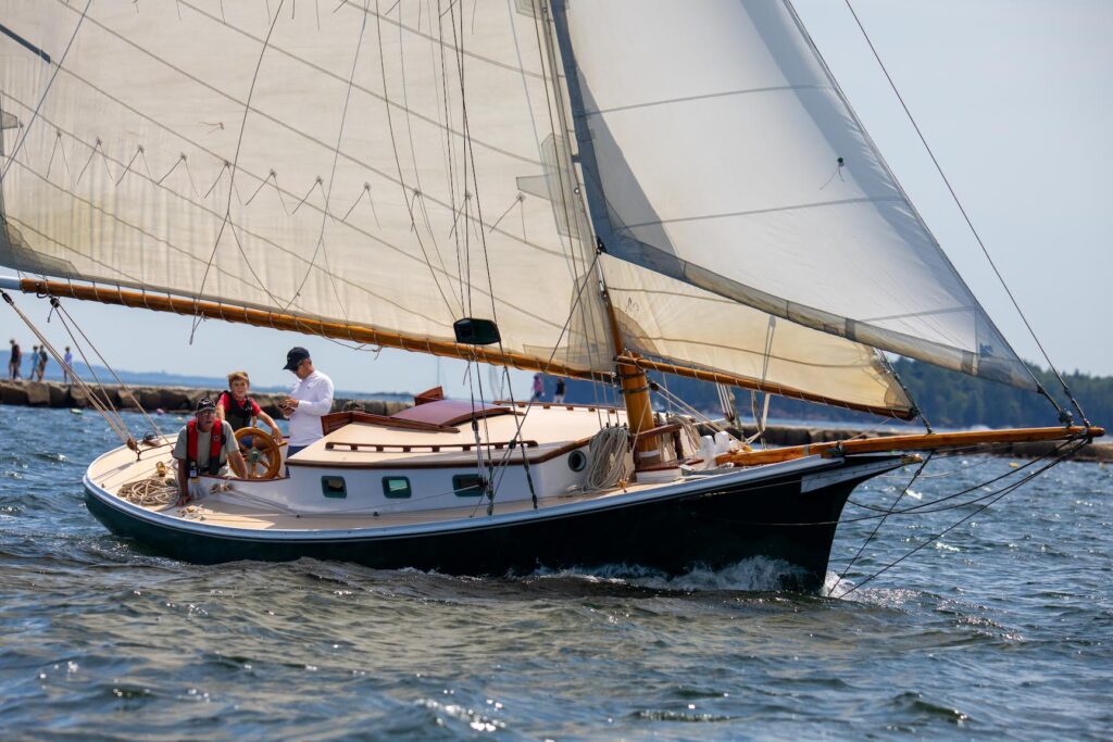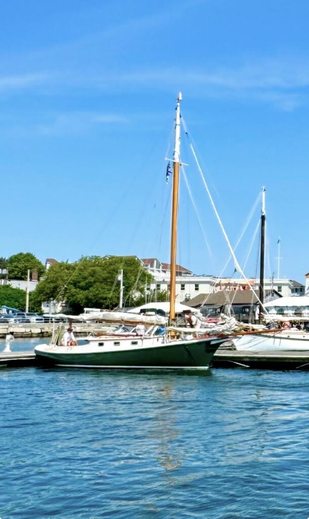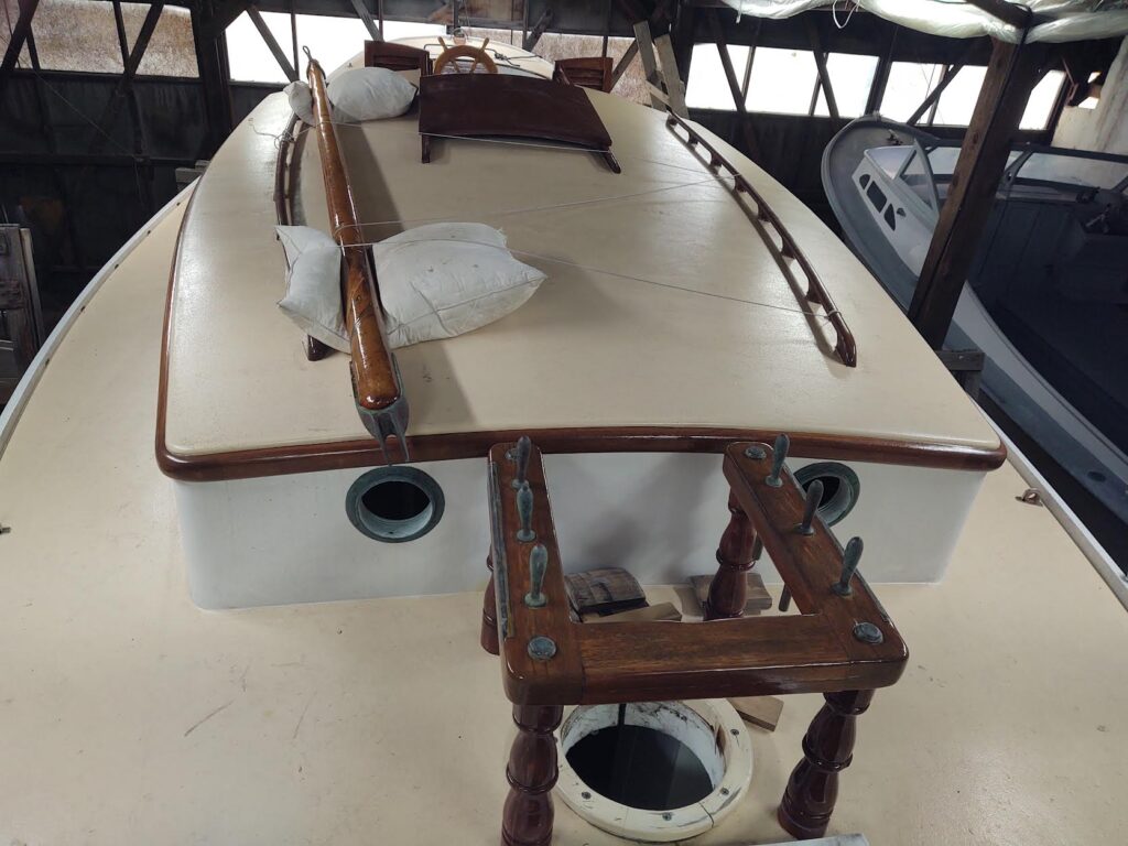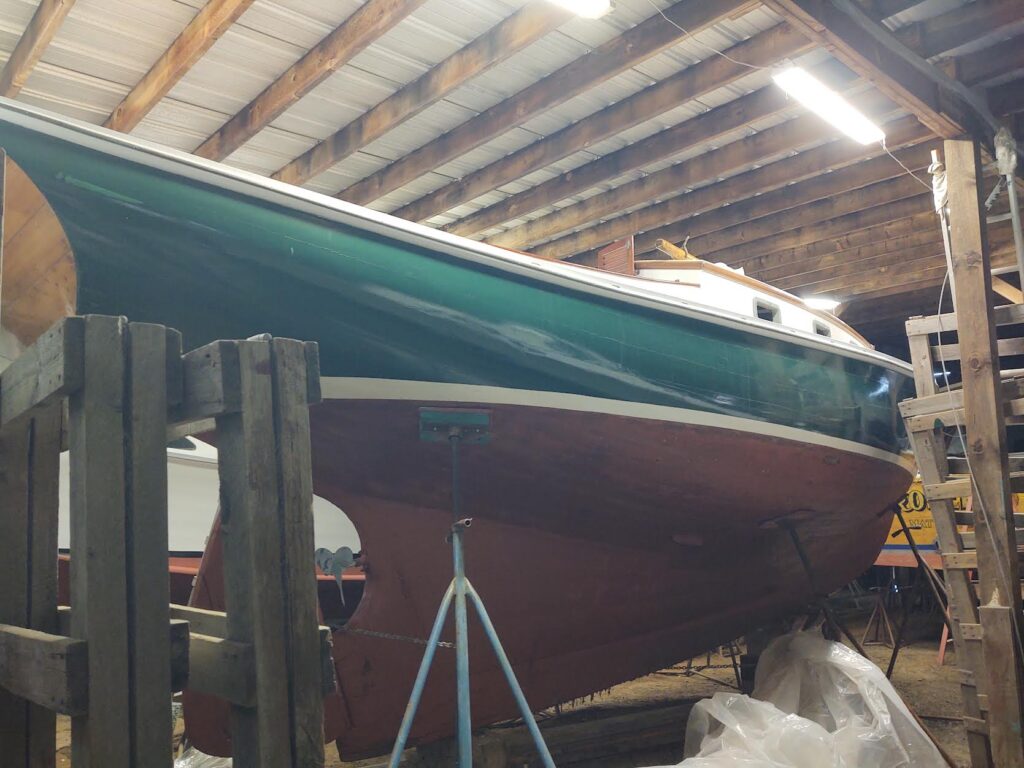She is built in the traditional method of cedar over oak (planking over frames/structure). In 2014 I had a new, Sitka spruce, hollow mast fabricated by Jim Elk in Bar Harbor, ME. Pleased with Jim’s work, and work ethic, I gave him the boat for a major refit and upgrade, mostly topside and interior work, including a new cabin top, toe rails etc. In the ensuing years, she has had additional structural upkeep including some below the water line planking replacement, including garboards, keel bolt inspection, new stern tube and aft deck, beam and clamp upgrades, which were performed by Triad Boatworks/myself. In 2017 a good portion of the bottom was additionally fastened, and water stops replaced by Wooden Tangent. For the past eight years her winter storage has been inside at Triad in Mattapoisett, MA, and where she is currently located.