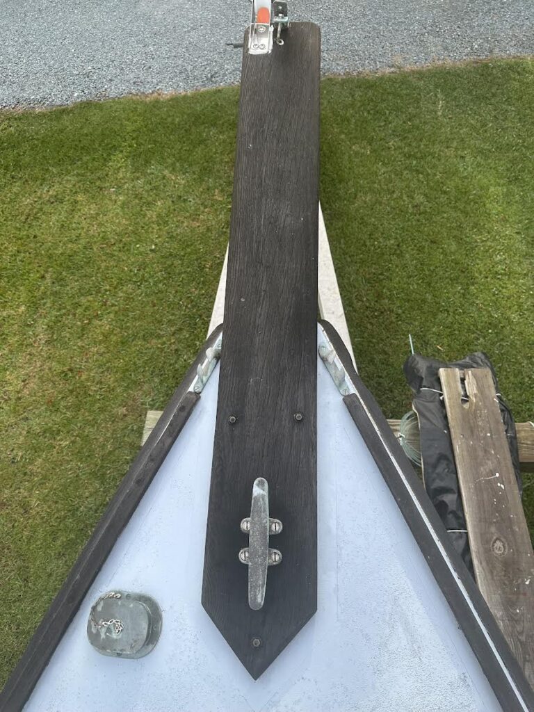 OH NO III was one of over seventy boats crafted by Emerson Willard, who built her in 1985 for his retirement. For a decade, Willard and his wife often cruised North Carolina waters and reached as far south as Sanford, Fl., along the headwaters of the St. Johns River. She was laid up for years preceding his death at 104 and rescued last year by friends who pulled her from his hurricane damaged shop that threatened to fall down on top of her. Her ketch rig, shoal draft, mast tabernacles, fixed gas, water and wastewater holding tanks made her ideal for their solo, sound and coastal river cruising. Her hull is fiberglass reinforced marine plywood. Draft is 18” with board up. Over the past year she has undergone an extensive refit and minor repairs to the hull and rig. Currently on the hard in Wilmington, NC.