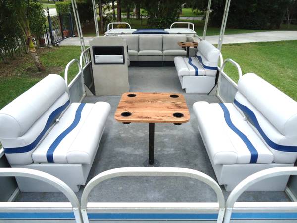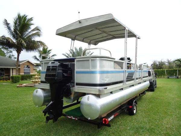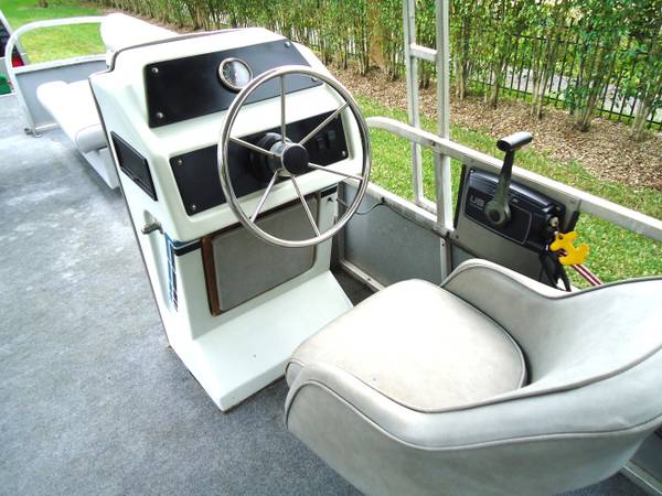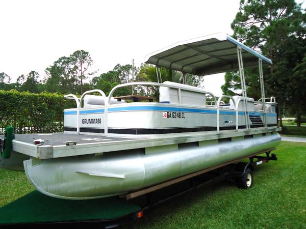 1990 Grumman Pontoon Boat 24′, party barge boats, Mercury Force 85 hp outboard great compression 130psi all three cylinders, family fun boat, starts right up and runs strong, includes hard top, Trailer is optional $1000, $4800 or $5800 w/ trailer,