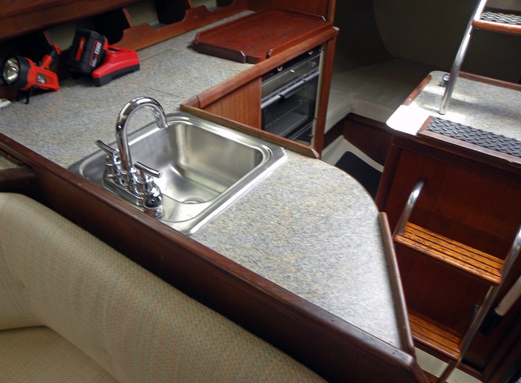 [ ]         Newly replaced faux granite high pressure laminate counter tops – galley, engine compartment, dinette table                                                                                          [ ]            Hot/Cold pressurized water system                                                                                                                                                                                                                            [ ]         New Elkay Celebrity stainless steel kitchen sink w/stopper                                                                                                                                                                                    [ ]         New Moen hot/cold stainless steel sink faucets                                                                                                                                                                                                          [ ]         ORIGO 6000 gimballed 2-burner range top and 2-level oven                                                                                                                                                                                [ ]         Below counter icebox                                                                                                                                                                                                                                                        [ ]         37 gal / 140 ltrs fresh water tank                                                                                                                                                                                                                                    [ ]         Custom wood countertop serving tray covering the stovetop                                                                                                                                                                                  [ ]            Upgraded overhead LED galley lights
