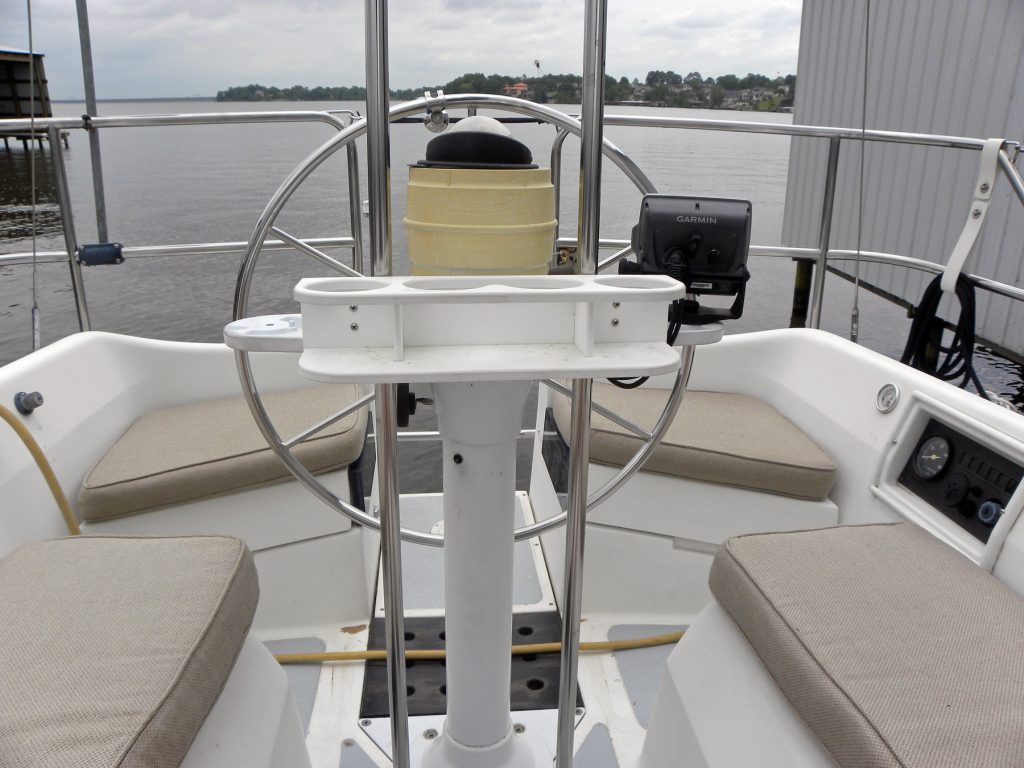 [ ]         T-shaped cockpit                                                                                                                                                                                                                                                                [ ]         Walk-through transom w/two (2) external storage lockers                                                                                                                                                                                      [ ]         Wrap-around coamings                                                                                                                                                                                                                                                    [ ]         Edson standing pedestal helm with stainless steel 48” steering wheel. Engine controls, mounted lighted compass and chart plotter mounted to stand                [ ]         Two under seat cockpit lockers (a) w/access to diesel storage tank and shore power plugs (b) storage for additional lines, hand pump, various pieces                  [ ]         Davis Vantage Vue stern rail-mounted weather monitoring system