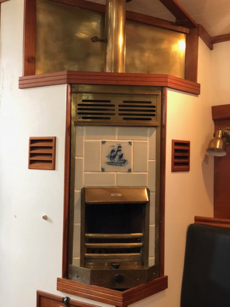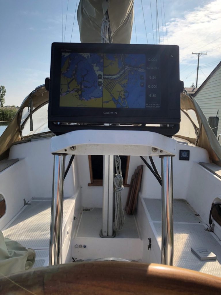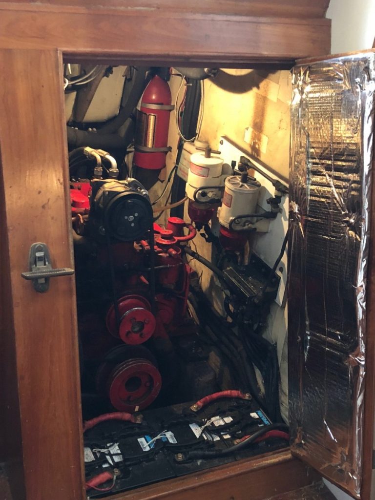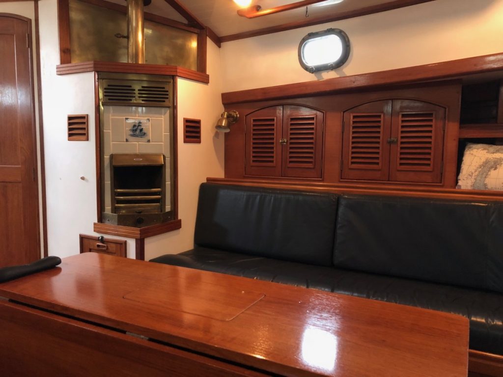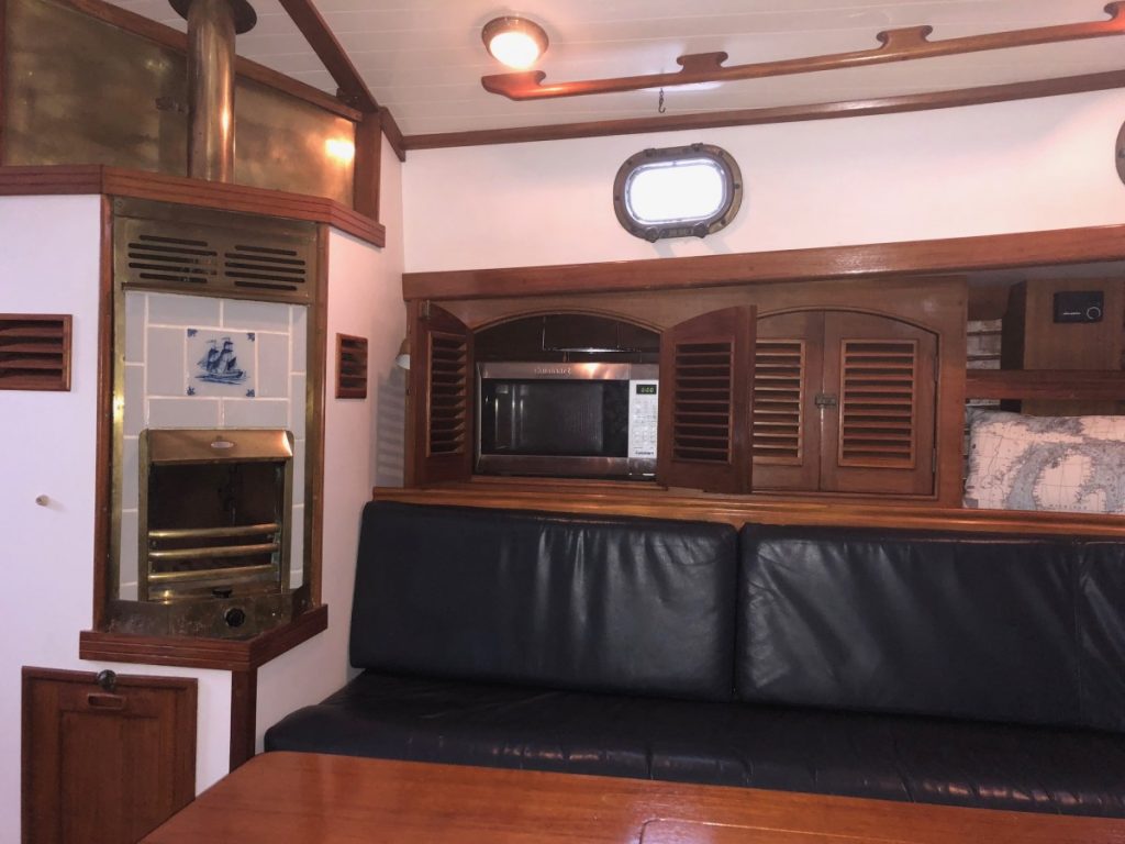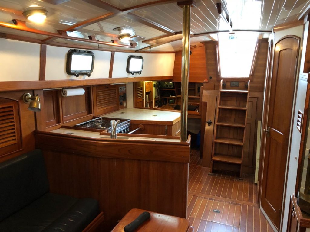The main salon features a hand craft teak traditional drop leaf table to provide dining for six comfortably, and a Sharpe flat screen TV with enhanced sound bar speakers (new 2015) To starboard is sliding settee double berth with book shelves and lockers with settee back storage outboard. The settee has a lee-cloth, pulls out to a double berth and has drawers under. To port is a sliding settee single berth with louvered lockers, shelves and storage outboard. The settee has a lee-cloth, pulls out to a single berth and has drawers beneath and additional storage behind. Aft of the port settee is a beautiful Luke brass and tile fireplace. To starboard is the spacious offshore U-Galley with deep double stainless steel sinks, Corian countertops (new 2016), three burner propane stove with oven, microwave convection oven (new 2014) and refrigerator with top and side loading doors and a separate freezer compartment. Aft of the galley is the navigation station with 12VDC/110VAC electrical distribution panels and adjustable swivel seat. To port side is the aft head, with dual door entry from either the main salon or aft cabin. The aft head has a built-in medicine cabinet and vanity, with Corian top (new 2016) , shower and a large vanity mirror and full length mirror on the door leading to the aft stateroom. The aft stateroom to port has a built-in cedar-lined hanging locker, drawers and double berth. The entire interior is heated through a hot forced-air duct system by an Espar 12VDC diesel heater.