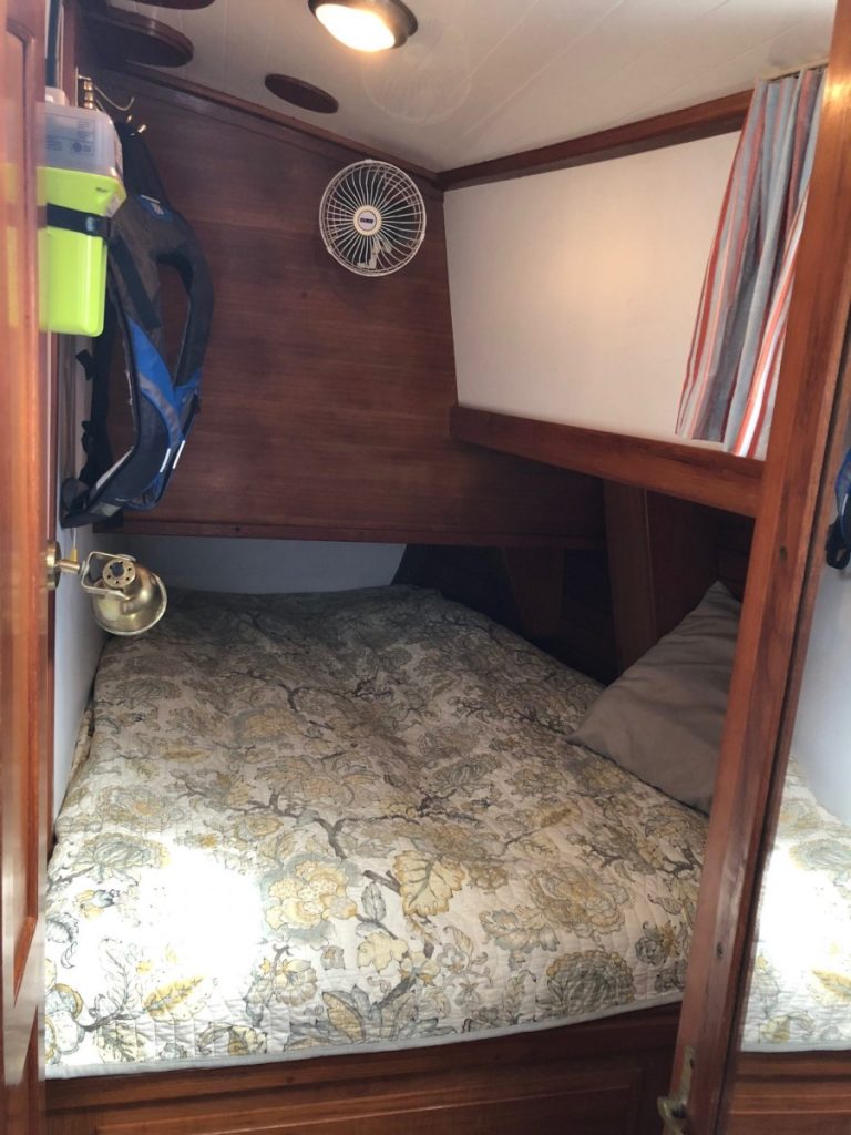 The main salon features a hand craft teak traditional drop leaf table to provide dining for six comfortably, and a Sharpe flat screen TV with enhanced sound bar speakers (new 2015) To starboard is sliding settee double berth with book shelves and lockers with settee back storage outboard. The settee has a lee-cloth, pulls out to a double berth and has drawers under. To port is a sliding settee single berth with louvered lockers, shelfs and storage outboard. The settee has a lee-cloth, pulls out to a single berth and has drawers beneath and additional storage behind. Aft of the port settee is a beautiful Luke brass and tile fireplace. To starboard is the spacious offshore U-Galley with deep double stainless steel sinks, Corian countertops (new 2016), three burner propane stove with oven, microwave convection oven (new 2014) and refrigerator with top and side loading doors and a separate freezer compartment. Aft of the galley is the navigation station with 12VDC/110VAC electrical distribution panels and adjustable swivel seat. To port side is the aft head, with dual door entry from either the main salon or aft cabin. The aft head has a built-in medicine cabinet and vanity, with Corian top (new 2016) , shower and a large vanity mirror and full length mirror on the door leading to the aft stateroom. The aft stateroom to port has a built-in cedar-lined hanging locker, drawers and double berth. The entire interior is heated through a hot forced-air duct system by an Espar 12VDC diesel heater.