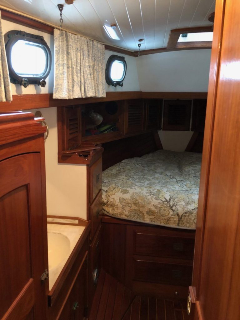 Accommodations Forward is the owners stateroom with spacious V-berth with louvered shelf lockers outboard and drawers under. A medicine cabinet and vanity with Corian countertop (new in 2016), is built-in to port with a cedar-lined hanging locker and drawers. To starboard are additional tall lockers and a head with a separate shower stall, plus a privacy door.
