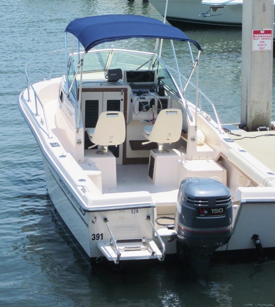 1996 Grady-White 208 Adventure with 150 Yamaha Saltwater Series II. Immaculate, turn-key condition. Always highly maintained and dry stored under cover. Many features: hydraulic trim tabs, hydraulic steering, swim platform, Raymarine GPS/Sonar, VHF, Stereo, dual batteries w/switch, compass, bimini top with full vista curtains in excellent condition, excellent upholstery, pressure water, live well, portable head, two anchors, all coast guard safety gear. A wonderful boat with no issues or needs. 735 hours on engine. Fresh full service with new water pump and upper seal. Runs strong, excellent compression. Sacrificing due to life circumstance. Incredible opportunity to own a Grady. No trailer.