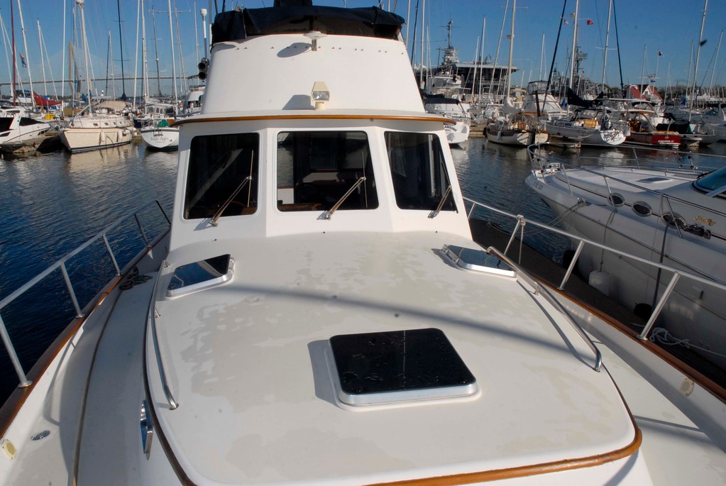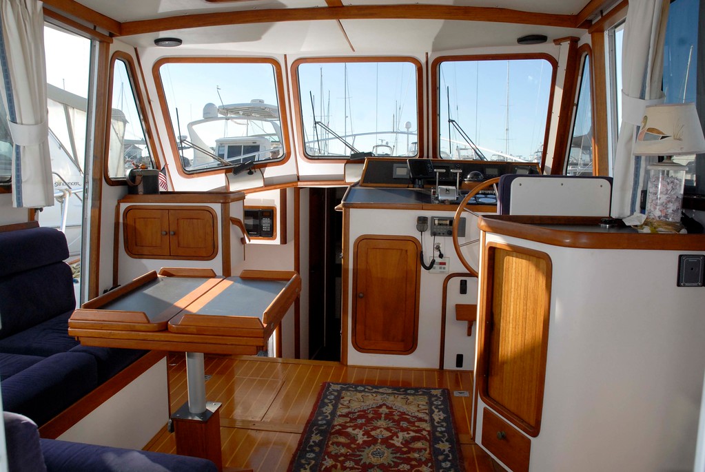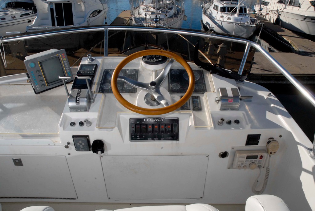 The Legacy Yachts 40 Sedan Bridge is an awesome cruising yacht, with upper and lower stations, port and starboard doors from the salon and extra tall windows thruout the salon, she is easily cruised by a couple. No blind spots, no problems getting around for line handling, anchoring or docking, she’s about perfect for any situation.