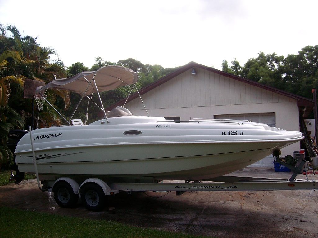 2003 24ft stardeck with alum trailer, new tires, 150 Suzuki fuel injected, hydraulic steering, this boat only has 69 hours on it, this boat is sweet everything works needs nothing, new stereo & speakers, bilge pump, motor just had full service done, has enclosed head, freshwater sink & shower, NADA value is $20,000 for sale $15,000 obo call brian 561 716 0948