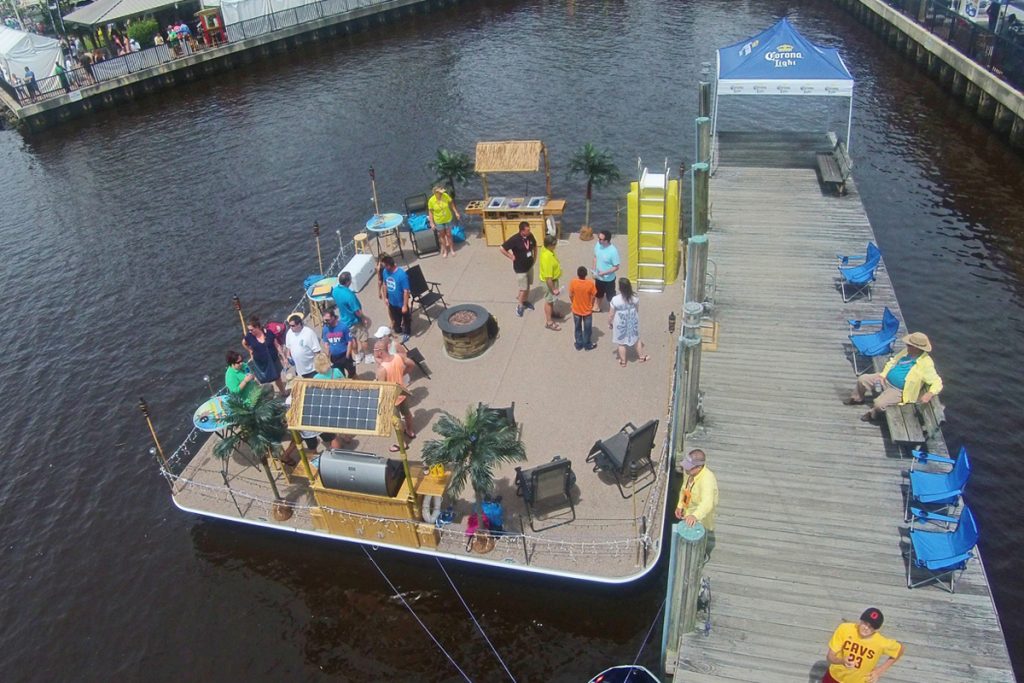 The Paradise Party Island is a non-motorized 25′ x 30′ platform that holds 45 people. It is solar powered and contains a BBQ grill, sink area, portable potty & changing area, propane fire pit, stereo with speakers & sub-woofer, custom trailer, etc.