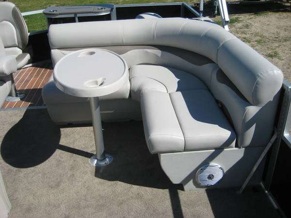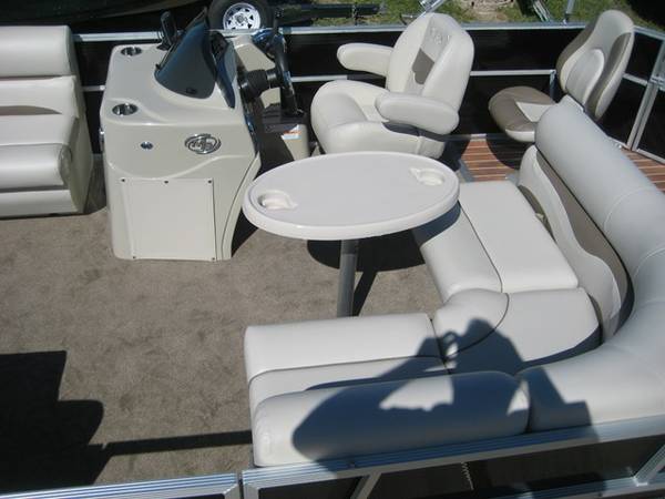 With Storage, Wrap Around Seating With Storage, Table, 2 Fishing Seats In The Back With Holly Vinyl Flooring, Live Well, Rod Storage, New Battery, 27 Gallon Built-In Gas Tank, 4 Step Rear Ladder, LED Docking Lights, New Battery, Hummingbird 153 Depth Finder, Jensen Bluetooth Radio, Bimini Top, 3 Gates, 25″ Tubes, Play Pen Cover. Rated For 10 People.