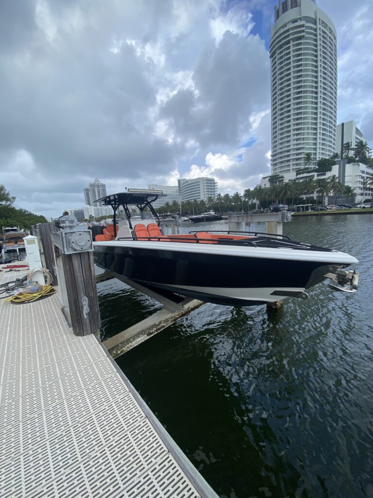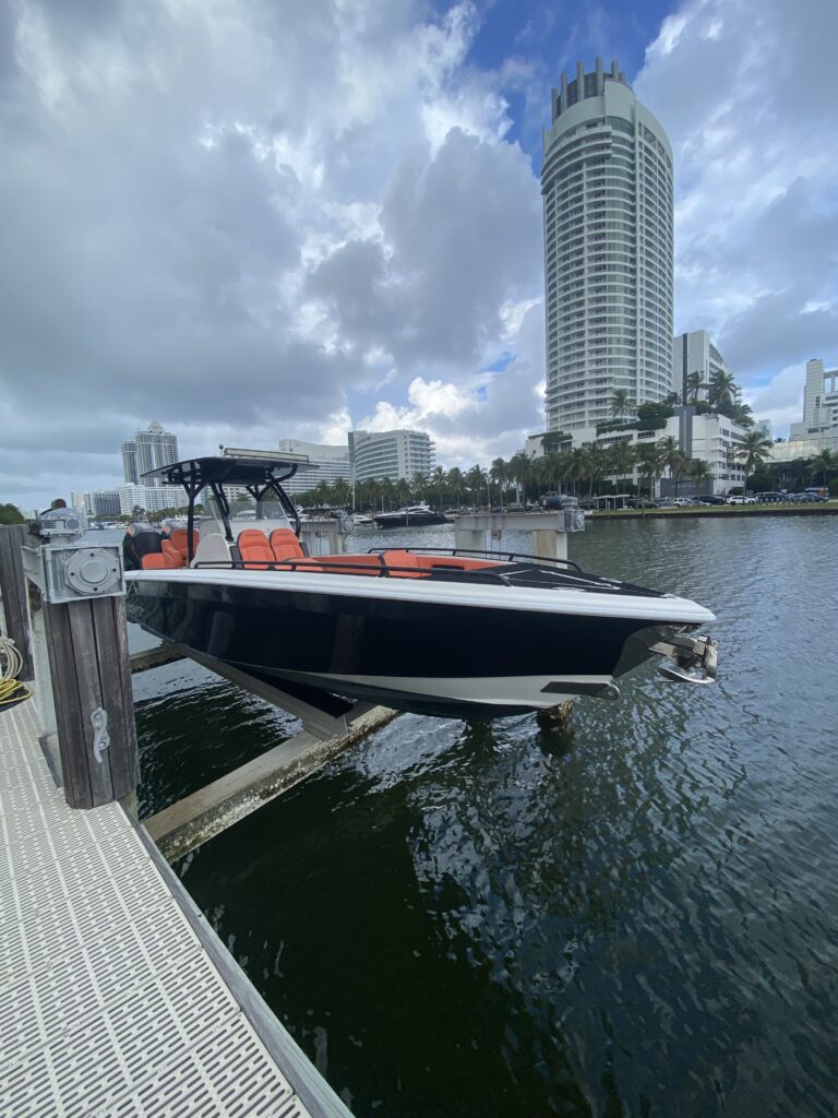 This boat has been meticulously maintained by its original owner and kept on a lift in Miami—no bottom paint, clean hull, and fully operational systems.