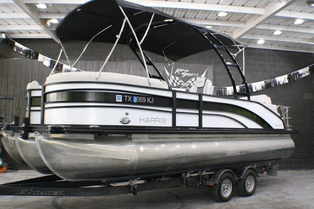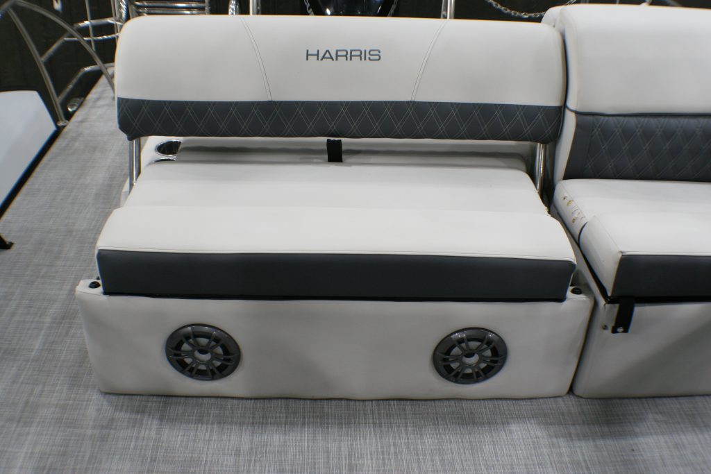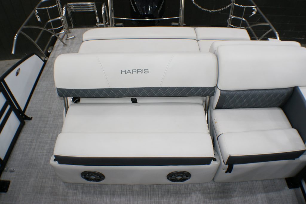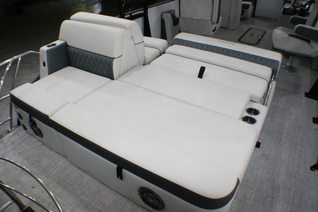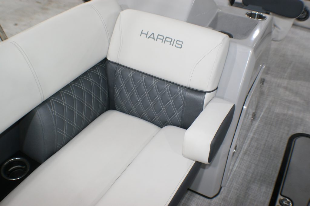This Harris Sunliner 230 Sport mixes impressive handling with a higher level of trim and convenience. The exterior features a fence profile, highlighted by a sleek taper and black rails. Jump on board you’ll find an upgraded interior, with pillow-top furniture covered in new soft-touch vinyl and lumbar recesses. There’s a pair of cup holders, along with dual USB ports to top off electronics, placed within each cutaway.