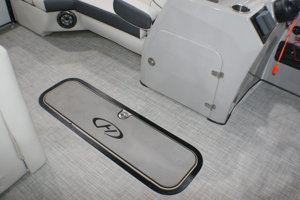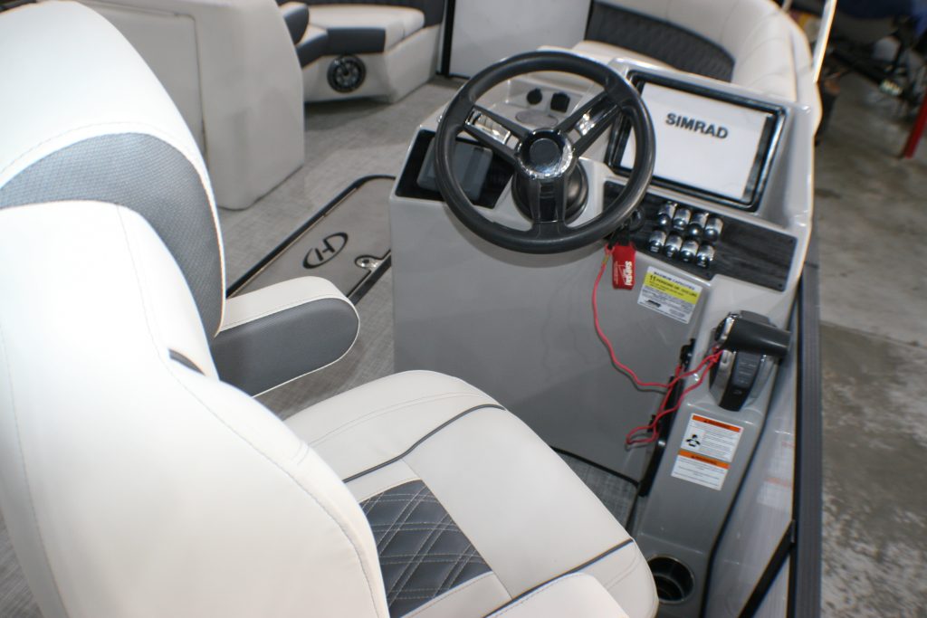 The dash has a Simrad GO9 which is offset to be easily viewed without interference from the steering wheel. The convenient dash tray is a great spot to throw your phone. It has a USB port and 12-volt outlets. With the Mercury 225 hp this Sunliner 230 goes onto plane quick and the handling is equally impressive.