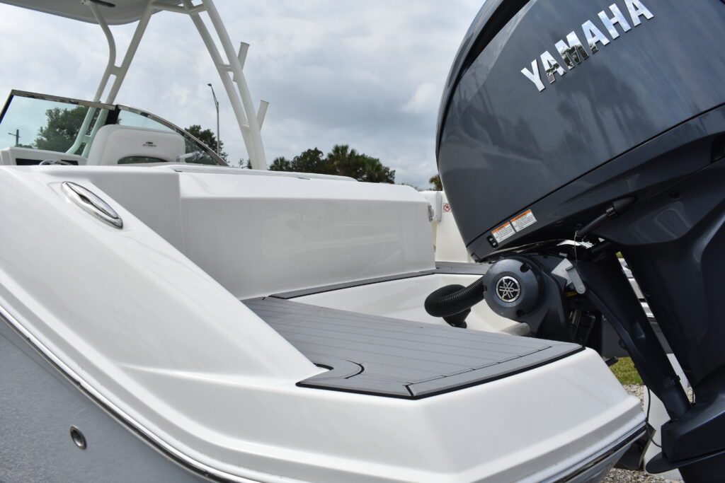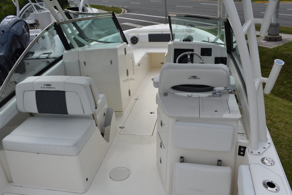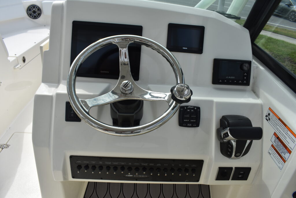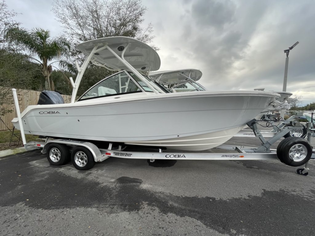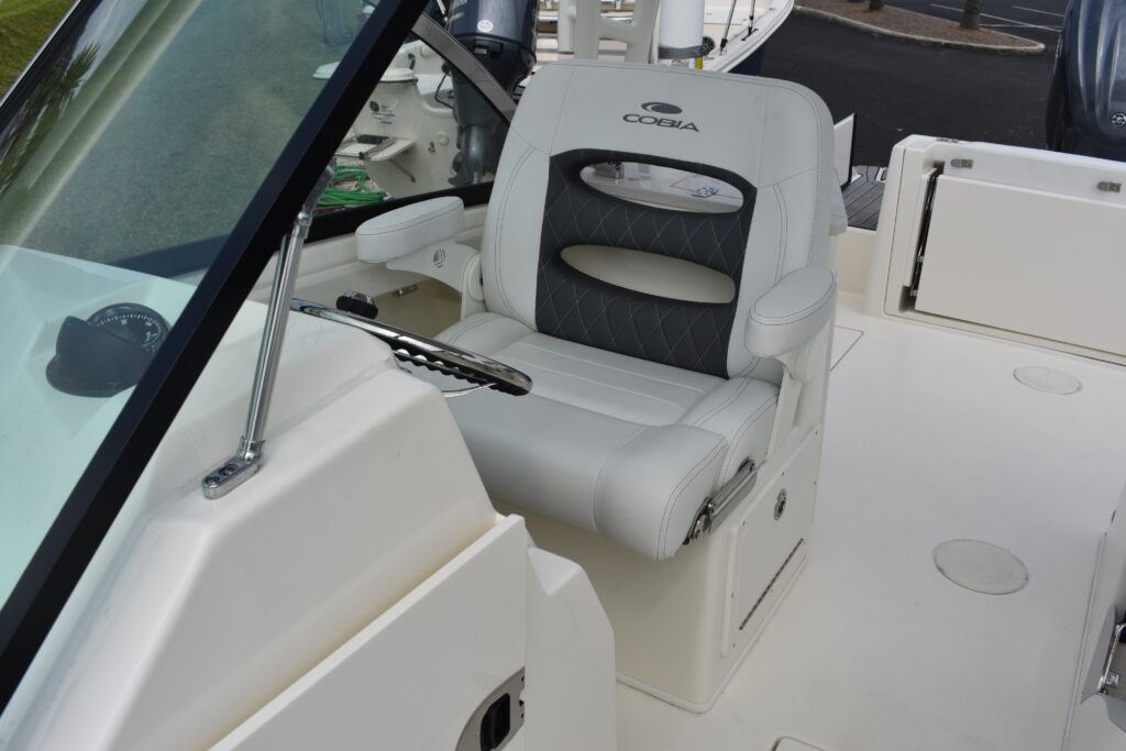 2023 Cobia Boats 240 DC, Powered with a Yamaha F300 with Helm Master EX DES, this beautiful Whisper Grey boat features the following upgrades: Stainless Steel Edson steering wheel with Power Knob, trim tabs & indicator, two tone hull (grey & white), grey & black faux teak deck mat on the console floor and swim platform, hard top, aft sun shade, JL Audio Stereo with amp & 8 speakers, raw water washdown, forward table and sun lounge, GPSMAP 8616 XSV with Airmar B60M Transducer and VHF antenna, fish box pump out with macerator, deluxe windlass with chain, 300′ rode, anchor & stem chafing guard and wireless remote, matching hardtop color (underside), powder coated console, white rub rails with stainless insert, 3 bank battery charger, 2 series 31 batteries 2023 Cobia Boats 240DCThe 24 Dual Console You’ve Been Waiting For.The most feature packed 24 foot dual console on the water! From its spacious and clean layout to its wealth of smart amenities, the new Cobia 240 DC beckons you to a relaxing, sun-drenched day on the water. Dedicated seating with deluxe, Bentley-style upholstery for nine, including a hideaway aft bench and a convertible first-mate’s chaise lounge, means everybody on board will ride in style and comfort. Additional standard family features include a hardtop with LED down lighting and ski pylon, walk down head with sink, Corian countertop and macerated electric head, and an extended swim platform with hidden telescoping ladder. It even comes with a standard bow boarding ladder and the option for a plug-in bow table. But just because comfort is at a premium it doesn’t mean that the serious angler is forgotten. This boat expertly melds all its soft touches with standard fishing features like dual in-floor 24 gallon fishboxes (macerators optional), a 22 gallon fully plumbed livewell, plenty of rod and tackle storage, and a bait prep area with sink. Combine all this and there’s no better looking, more feature rich and better performing 24 foot dual console on the water.Features may include:Steering and HandlingHydraulic tilt steeringPropTrim tabsYamaha fuel/water separator & control cables (w/ engine option)Quality Finish and ConstructionPremium fade-resistant gelcoatStainless steel rub railStainless steel thru-hulls w/ seacocks below water lineFamilyBoarding ladder (covered stern, hideaway bow)Cockpit bolsters (aft)Cushion, bow (8 pc set)Electric head w/ maceratorFresh water at transom (9 gal tank for 2 sinks and shower)Fresh water sink in head & prep stationHead comfort appointments (tp holder, mirror)Hideaway aft bench seatingInsulated cooler in port lounge (91 qt)Integrated ski tow pylon on towerPlush seating for up to 9 passengersPrep station w/ sinkRoomy walk down head area with sink and Corian topSwim/dive platform extendedT-top fiberglass hard top (w/ spreader llight & rod holders)Tri-color platinum cushions with custom Bentley stitchingUSB outlets and cupholders throughoutFishingCockpit insulated fish boxes (2, 24 gal)Livewell (22 gal)SS gunnel rod holders (2 port, 2 stbd)Cockpit and StorageAnchor lockerHelm seat premiumSelf-bailing cockpitSafety, Comfort and ConvenienceBow rail (fully recessed)Cockpit lights, compass & helm footrestConvertible lounge seatingRear seating w/ backrestSS flush mount pull-up cleats (7)Standard all glass wraparound windshieldLights and ElectricSS flush mount flip-up bow lightWaterproof Deutsch electrical connectors