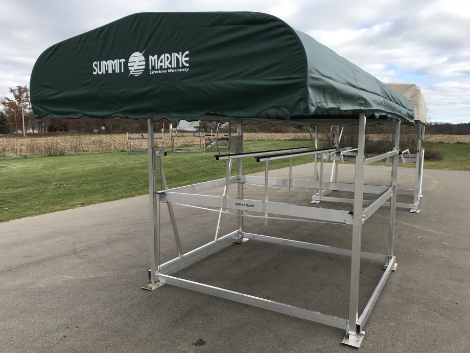 Summit 45120 (4500# capacity, 120″ beam). Lightweight aluminum construction with stainless steel cables, vinyl/aluminum bunks, easy walk thru “V” side. Shown here with optional load guides. Perfect for ski boats, pontoons or runabouts. Also equipped with an easy to operate 16:1 winch and 4 adjustable legs to level the lift. 15 Year WARRANTY!
