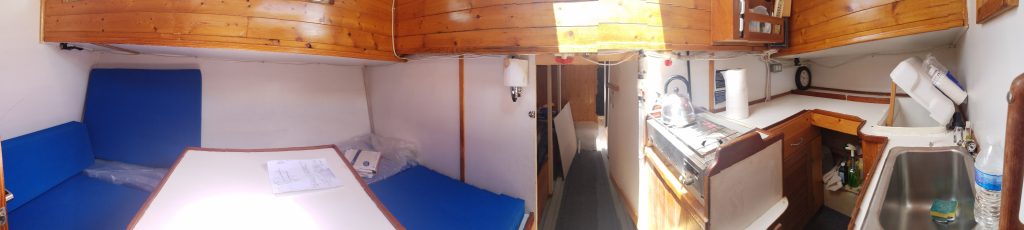 TWO CABIN V BUNKS ( DINETTE IN FWD CABIN NAES INTO LARGE BED , GALLEY AND HEAD WITH SHOWER (LEE VAC-HEAD) FOLD DOWN CHART TABLE .