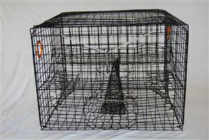 This pot has two chambers (upper and lower), two entrance funnels, and a bait box which is accessed from the underside of the pot. It also has a large door on the top of the trap for easy removal of the craps. This pot will also catch fish which you can use for bait.