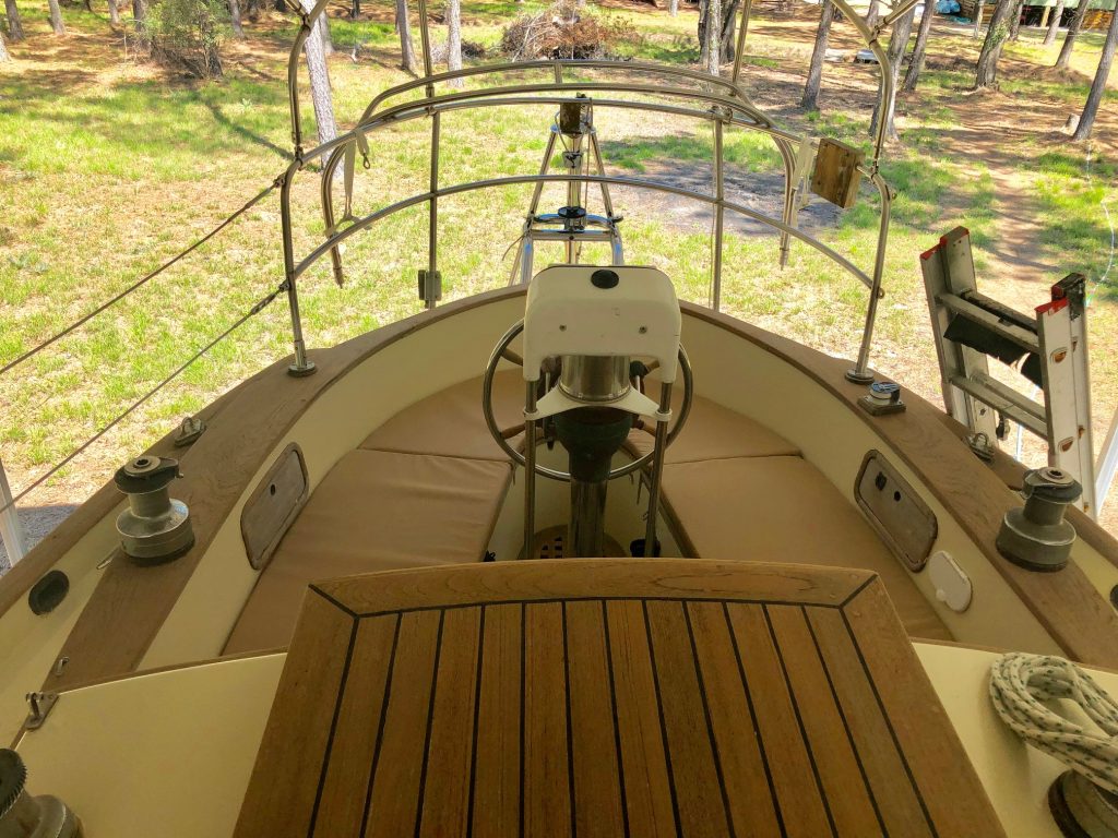 Deck is fiberglass, installed 2019. Deck non-skid paint is kiwi grip cream 2019. Depth gauge and compass on binnacle. Barient winches for all sails.