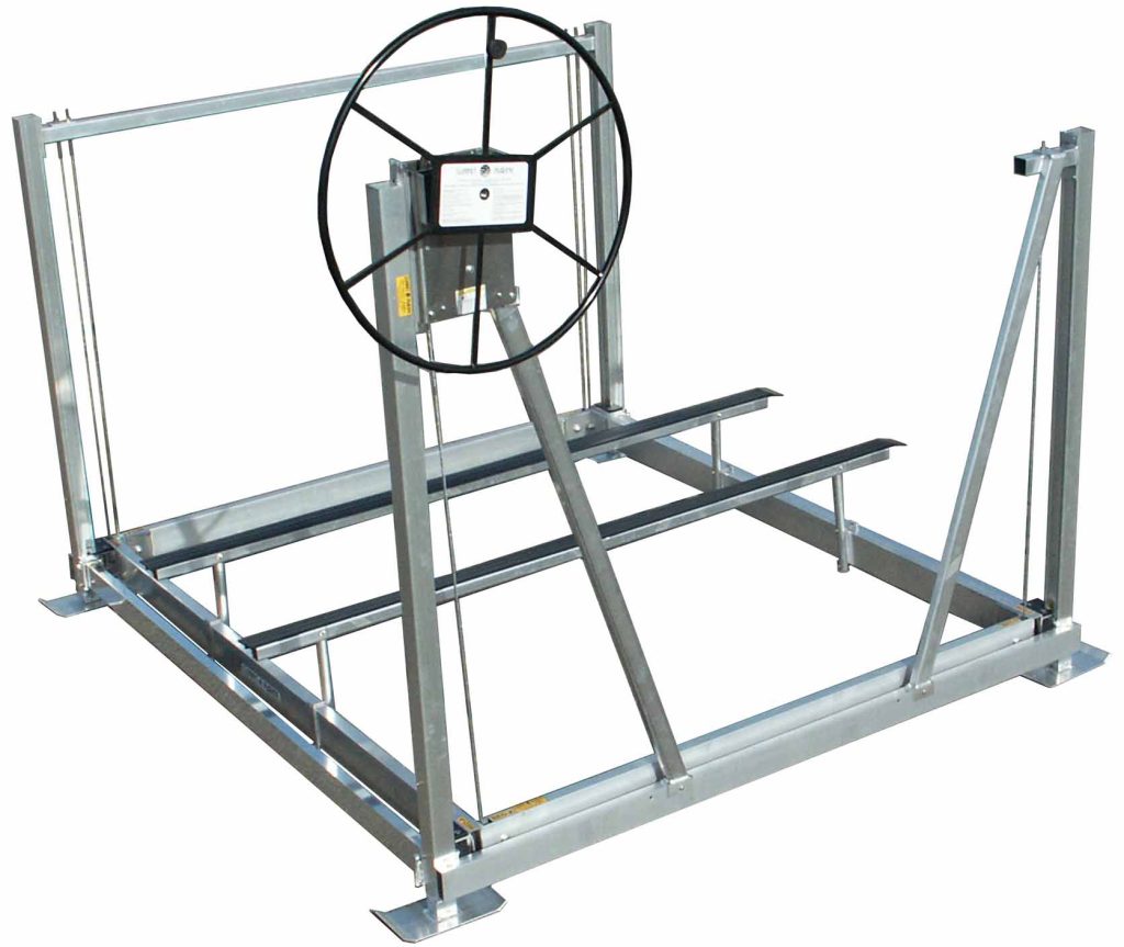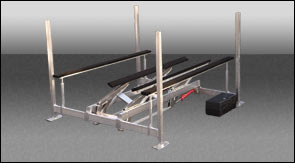 Summit 45120 (4500# capacity, 120″ beam). Lightweight aluminum construction with stainless steel cables, vinyl/aluminum bunks, easy walk thru “V” side. Shown here with optional load guides. Perfect for ski boats, pontoons or runabouts. Also equipped with an easy to operate 16:1 winch and 4 adjustable legs to level the lift. 15 Year WARRANTY!