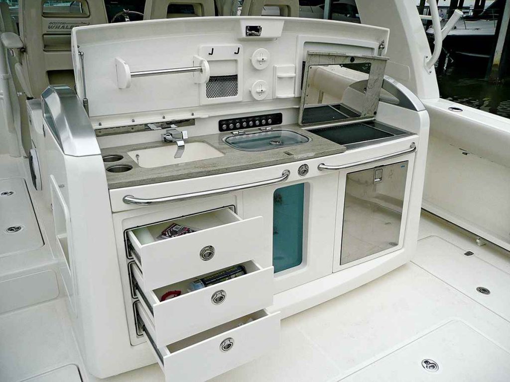 Everything about the 420 is inviting, evidenced by two access doors located aft one on the port side for boarding or boating large fish, the other on the transom, to starboard, to allow access for swimmers with the removable ladder. Next to catch my eye was the center console, with two rows of seating and air-conditioning vents serving both. The front row consists of three bolster-style seats with fold-down armrests. The center seat actuates electronically; the others rotate to face the rear. The second row, a leaning post that converts to a three-person bench, houses three tackle drawers, a 40-gallon pressurized aquarium-style livewell, and a bait-rigging station with sink that can be replaced with an optional summer kitchen with fridge and electric grill.