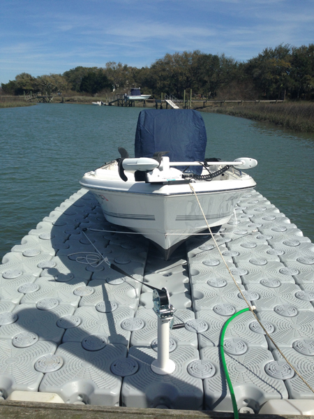 Available grey blocks and size is 8′ x 19.2′ and fits a boat up to 19 ft. We can add or subtract blocks if your boat is larger/smaller. The docking system is low maintenance and very sturdy.
