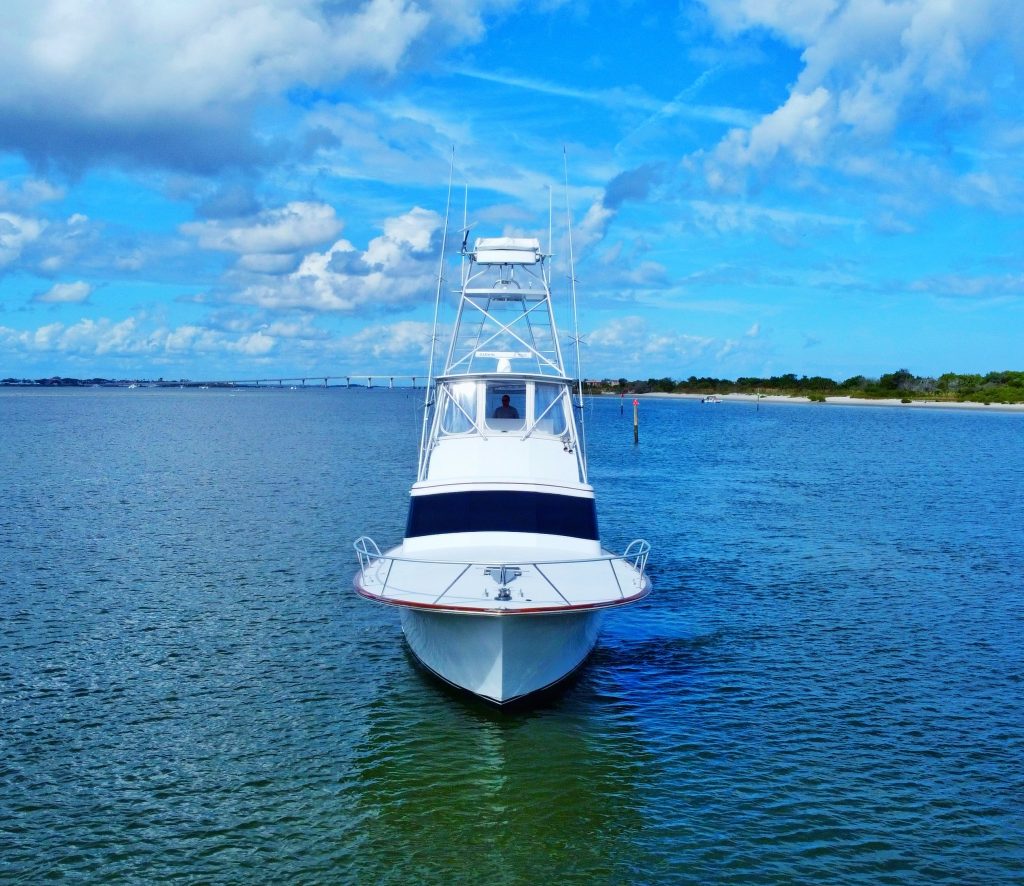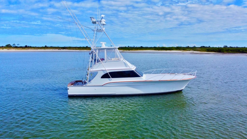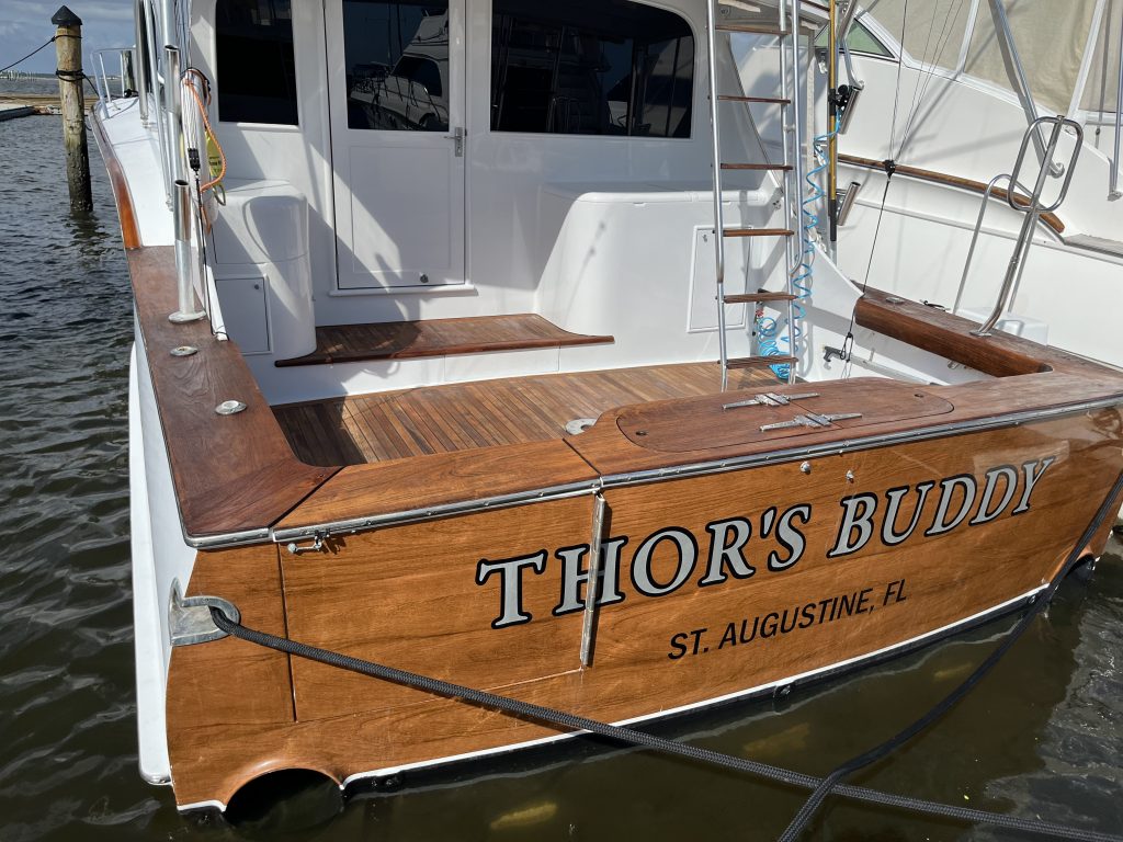 Salon Entering the salon from a teak swing door to starboard is the L-shaped leather settee with rod storage underneath. Forward of the settee, is a large chart table with chart storage and two drawers. To port aft is the electrical panel. Forward of the panel to port is a concealed lift door with spinning rod storage.