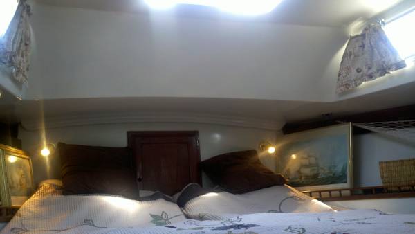 AFT CABIN KING SIZED MEMORY FOAM BED, TEAK DRESSER, TEAK STORAGE LOCKER, STORAGE BENEATH, SKYLIGHTS AND PORT LIGHTS, SLEEPS 2, EMERGENCY TILLER STEERING + HYDRAULIC PUMP AND HYDRAULIC PISTON ASSIST ON RUDDER POST BENEATH=POWER STEERING!