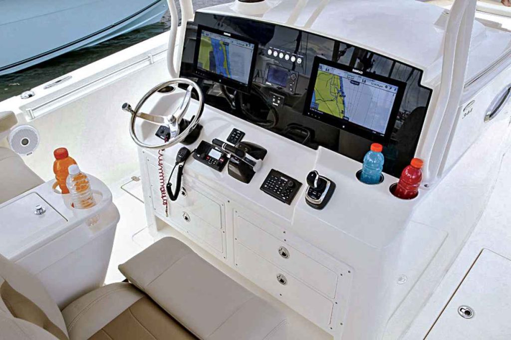 Cobia Boats calls the 344CC its new flagship, building on the stunning success of the Cobia 296. The double-stepped-hulled 344CC center-console boasts such fishing-friendly features as level decks and twin 41-gallon livewells, to which you can add pressurizing sea chests. Ready for success, two in-floor fish boxes are macerated to pump overboard. Rods store horizontally within the lockable console or topside in horizontal racks, in addition to vertical racks on the legs of an optional hardtop. A tackle center features sink, rigging area and tackle–storage drawers.