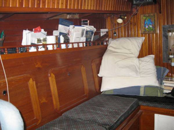 While on the hard she took on fresh rain water and cosmetically damaged the cushions, some storage items, and is need of some elbow grease for sanding and re-varnishing the mahogany interior.
