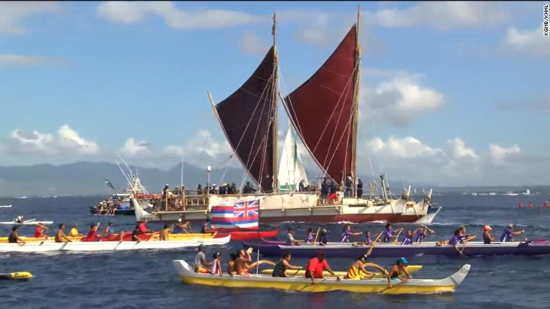 The Hokulea was greeted in the harbor by other replica Polynesian voyaging canoes as well as modern ships, sailboats, wave runners and paddle boarders.