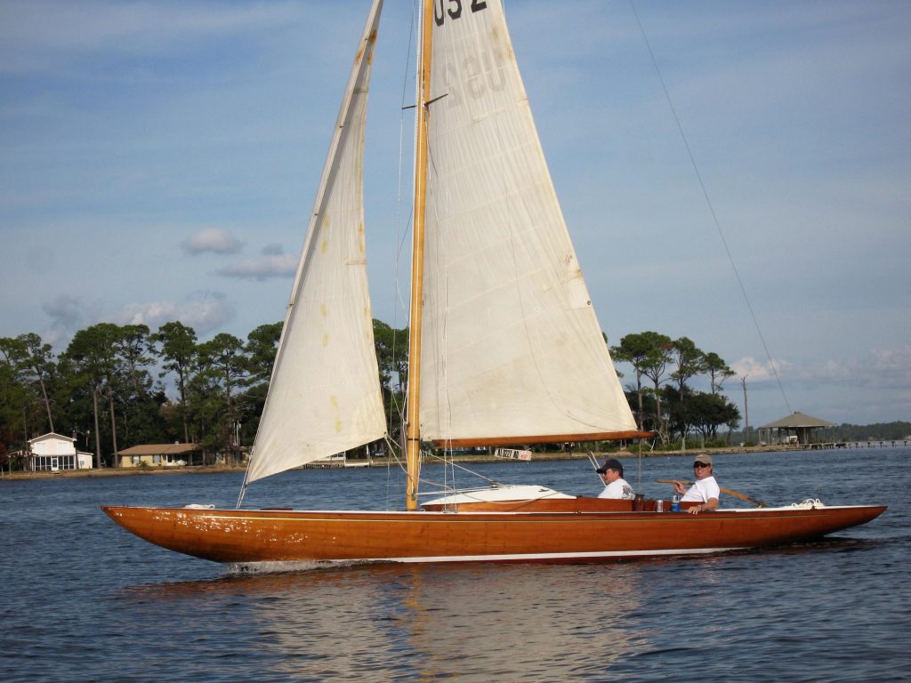 She is gaff-rigged with cedar planking on white oak frames, and includes a new Triad trailer. She has much of the original hardware with various replacement pieces through J.M. Renick & Sons. On the rigging, turnbuckles have been replaced and the shrouds have been parcelled and served. The boat does not currently have sails. She has complete coats of varnish on her brightwork and spars, and both the interior and exterior have been painted.