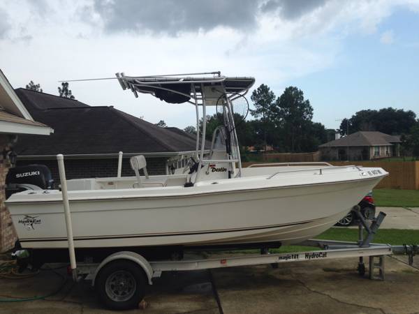 **2003 Hydrocat 18.5′ center console**, single hull fishing machine, 115 Suzuki 4 stroke, low hours, custom built t-top, in board wash down, live bait well, complete electronic package, cooler seats, turn key- ready to fish. Must sell or trade for bass boat or RV of comparable value. Moved to North Alabama. $10,000 OBO. See boat at Blue Angel Tire and Automotive.