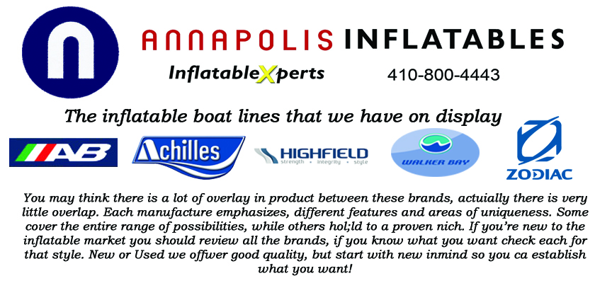 Annapolis Inflatables/Inflatable Xperts sells Zodiac, AB, Achilles, Walker Bay & Highfield Hypalon and PVC inflatable boats at a variety of price points, as well as used inflatables. We stock a comprehensive selection of inflatable boat accessories and parts. We sell new outboards by Tohatsu and Honda and have a variety of used motors available. If you’re shopping with us on-line and don’t see what you need, please contact us. In most cases we can source it for you. We have full-service repair operation with pick up and delivery available to customers.