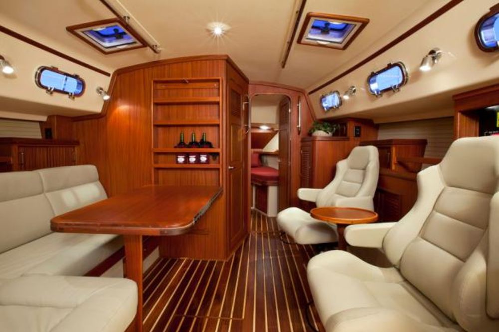 The saloon functions effectively as living room, dining room, or, with the settee pulled out into a double berth, a third bedroom. However, the reclining chairs come at the expense of a usable navigation station/computer desk and a sea berth on the starboard side of the boat. Replacing the chairs with a starboard settee is an option, one that will appeal to those who plan to make several long passages a year.