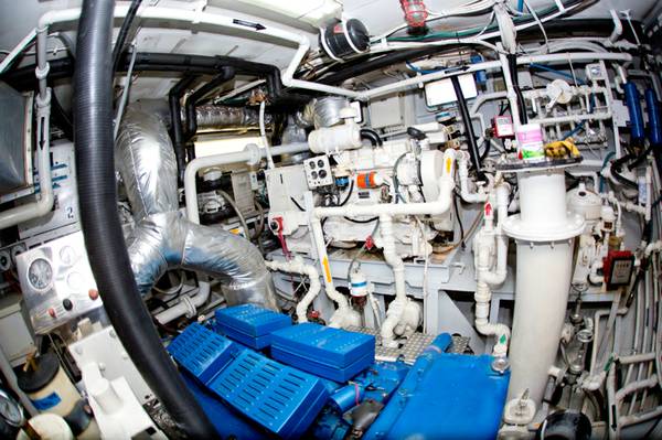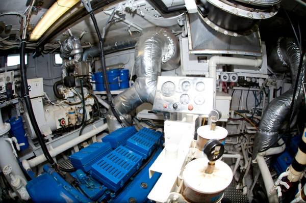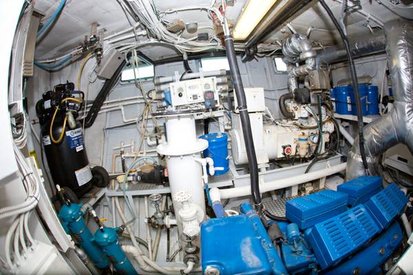 The refit also included new state-of-the-art pilothouse electronics and wiring throughout, new 40kW Yanmar genset and 90 hp Cummins diesel bow thruster, and new 10-ton air conditioning units. A new bulbous bow was installed for added speed and fuel savings along with a redesigned stern, with plenty of room for fishing and a new 700-gallon fuel day tank in the lazarette. All hull areas, including the lazarette, engine room and chain locker, have been sandblasted to bare metal, primed with two coats of epoxy primer and painted with two coats of Awlgrip paint, including zincs. The water filtration system and water maker were completely replaced and upgraded, producing clean water down to one micron, which is better than any municipal water system. The 2200 gallons of fresh water can be completely replenished in 20-30 hours. Additionally, a complete duplication of pumps, seals, a/c compressors, filters, and even tools were purchased. The main engine exhaust was reworked, voltage regulators/alternators rebuilt or replaced as well as main circuit breakers and shore power connections. The original stuffing boxes have been replaced with German-made dry seal shafts.