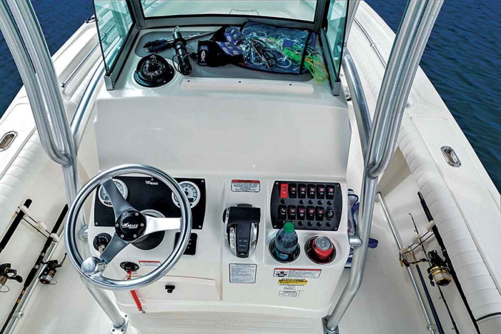Anglers want plenty of deck space, according to our survey, and the 214 provided it in a proportion belying the 21-foot vessel size. Under gunwale rod storage includes a toe rail to improve footing while leaning out to gaff a fish. At the helm, a dual seat with flip-up bolsters and a broad console to accommodate dual multifunction displays is protected behind a wraparound -windscreen. Below it is easy access to a compartment optionally equipped with a head.