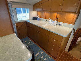 “TWO BITS” is a three Stateroom layout with three Heads with separate showers in each Head. The VIP stateroom in the Bow features a queen size berth with ensuite private Head. Built in TV, hanging locker and drawers. The guest Stateroom is located on the Port side featuring Upper & Lower berths with direct access to the day Head on the Starboard side. The Master is Aft with a queen size berth and private ensuite Head. The Main salon and living area feature a large sectional sofa on the Port side. Two steps up to the Starboard is a “L” shaped dinette with fixed table. The Galley is on the Port side a crossed from the dinette. Beautiful Teak woodwork throughout the vessel with barber carpeting and flax teak & holly factory provided.