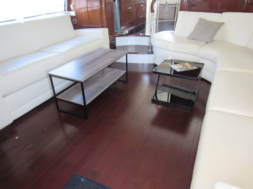 • Flybridge complete four side enclosure, custom carpeting, extended hardtop, Dual helm seats, Maxwell windlass,  yacht controller system- joystick, CAT engine gauges, Trim tab indicator, Garmin VHF and Radar, Garmin chart plotters dual, Fusion Sirius XM, Flybridge ice maker and wet bar with sink, Nova-Kool refrigerator, Viking life raft, 6 person settee with table, port forward bench seating, fore and aft bow and stern thrusters.
