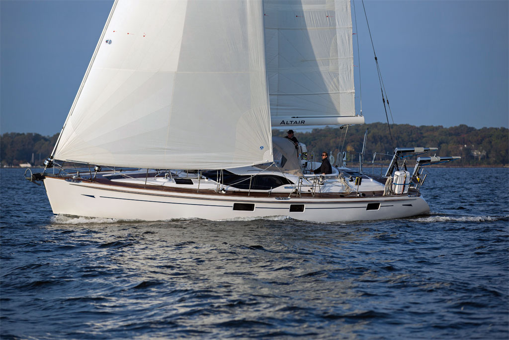 We sailed the boat in a light 8 to 10-knot true breeze on Chesapeake Bay in flat water. The helm, a cable-driven Lewmar system, did not provide much feedback in these soft conditions, but I assume with a boat this hefty it would snap to life in a stronger wind.