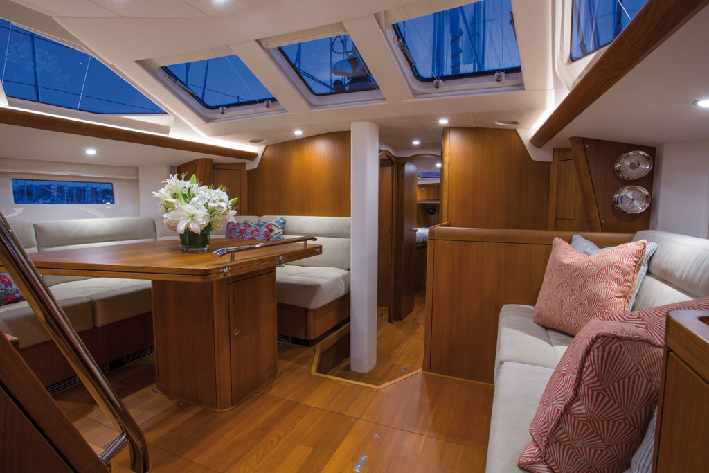 The saloon area is slightly raised, and though it purports to be a deck saloon, it is not quite high enough for folks to see out the expansive windows while seated at the dinette table. The table itself is huge and folds out to service the settees on both sides. In the standard layout, there are several guest berths (two over-and-under singles and a double V-berth) forward of the saloon and also a forward head. An alternative layout offers just one large stateroom forward with a generous Pullman double berth.