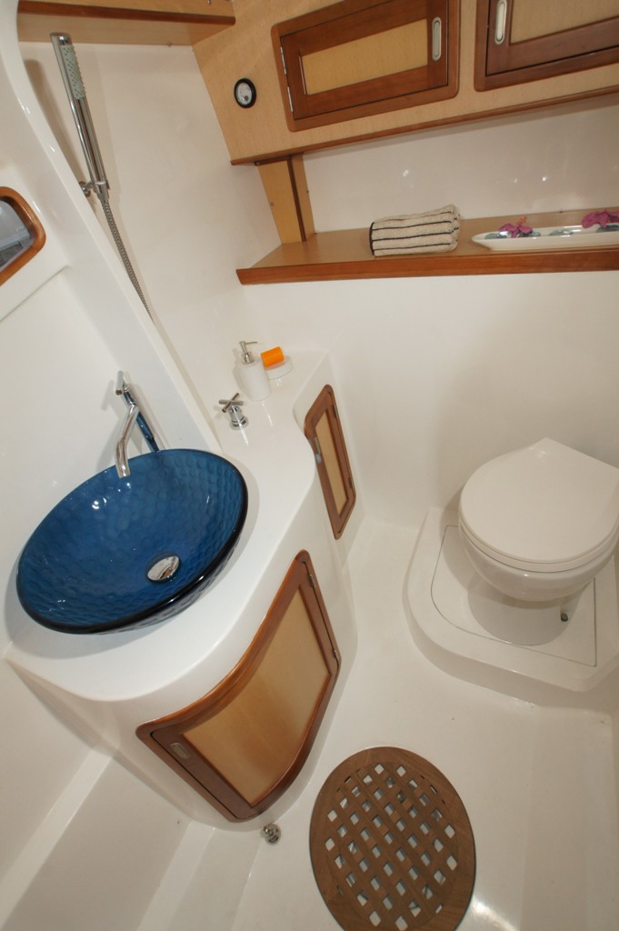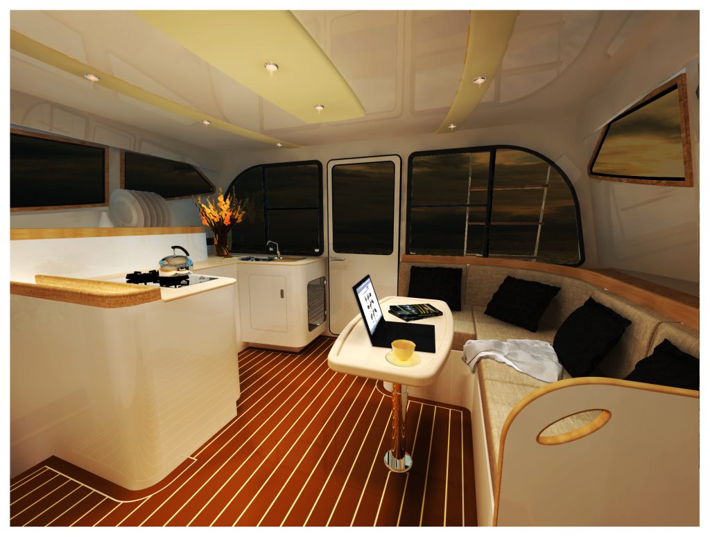 ALSO – NEW OB DESIGN = The Outboard model allows for future technologies like electric/solar/battery propulsion to be advanced without major mounting modifications, changing hull penetrations, etc. – virtually future proofing the design for the next 50 years. Outboards are so efficient these days and we can power it with any brand and size for you. The outboard model, and the easy trim/lift/tilt features provide for superior balance and load adjustment for performance. And these outboards are quickly accessed through a hatch, but hidden for the quality yacht appearance.
