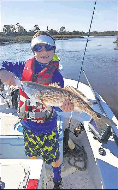 CONTRIBUTED PHOTO :Seven-year-old Jackson Dapas with a 24-inch redfish he caught with Captain Leon Dana. They were fishing live finger mullet up around Palm Valley earlier this week. Dana reports 70-plus degree water temperatures and lots of active reds.