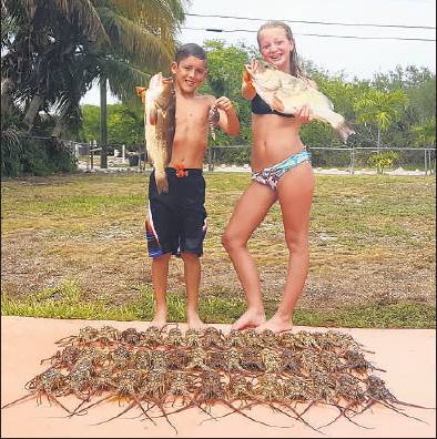 **CONTRIBUTED Photo** : Kayden Ryan, left, and Ryan Mae Essery with a couple of nice grouper and a bucketful of Florida lobster, caught during the August mini-season in the Keys. °
