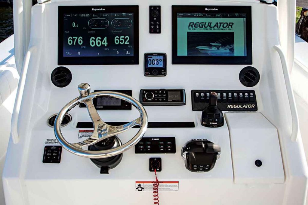 It only takes a glance at the 34 to see what those who know Regulator revere in the brand. Its lines are efficient, practical, rugged and beautiful. And that style is carried through to the interior. Contributing to high scores are the wide bow to stern walkways, uninterrupted by the surprising step found on so many center-consoles. Coaming pads around the boat are firm, the upholstery supple, with stain and UV resistance for a long life. Grab rails around the bow are recessed. Seating forward adds luxury, but the cushions are stowable for hard-core fishing, another attribute appreciated by Regulator fans.