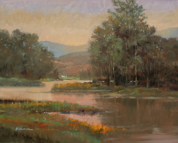 On most of my paintings I try to create three distinct values of light, middle tone, and darks. However at times either the very lights or the very darks can be minimized evoking a soft sense of light in the early morning or late afternoon hours. Such was the case with this painting. Also the colors were kept to a narrow range which helped give a better sense of atmosphere and mood as one color blends in with the colors next to it.
