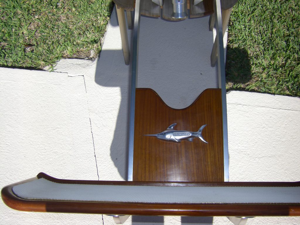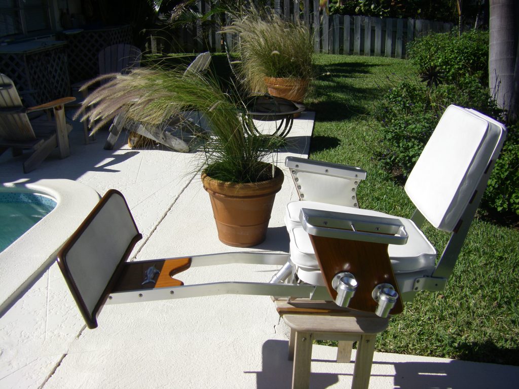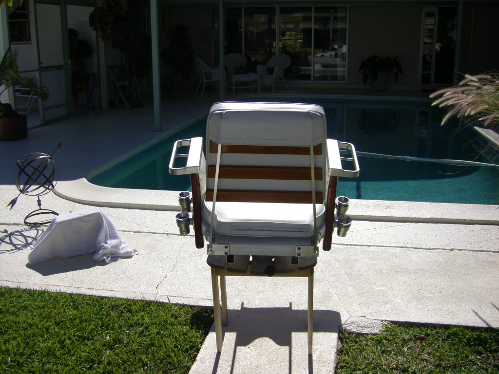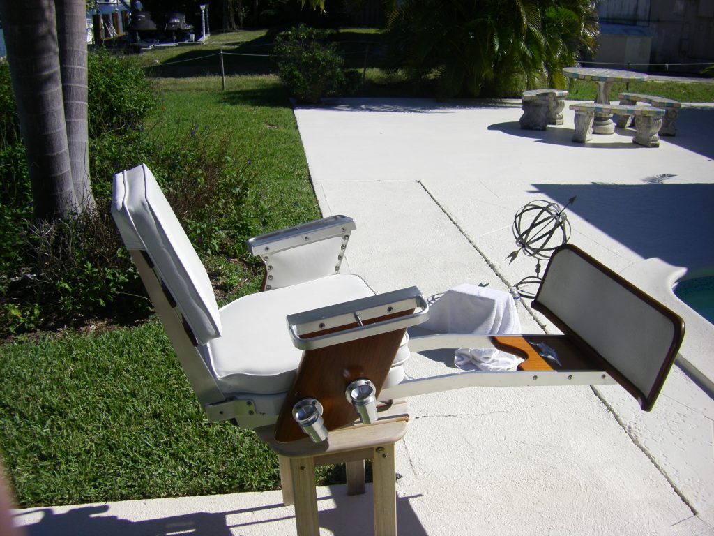 **This chair will accommodate the smaller cockpits with unlimited class rating**. Features 21″ X 21″ Fiberglass seat, teak wood ladder back, foot board, Anodized 6061 marine grade billet aluminum hardware, double side gimbals, four position reversible flip gimbal, cushion, back rest cushion and overall cover. The chair is missing a 3- 1/2″ pedestal and deck plate which are available at Scopinich in **Stuart,FL.**
