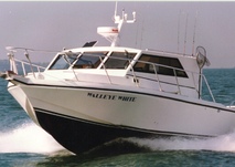 A single engine Sea Hawk 36 USCG Certified charter fishing boat with a full walk-around deck.