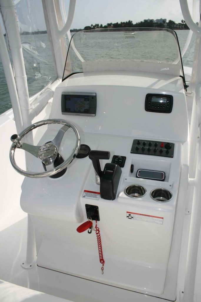 THE LAYOUT: A two-tier forward platform provides extra elevation for cast-netting, working a fish around the bow or manning the anchor. Boaters who do their own maintenance will love the big, yacht-style Total Access Hatch in the transom, which lets you easily reach pumps and other rigging. Inside the pod-style center console is a roomy head compartment with a screened port light. The helm features an integrated footrest and a spacious vertical panel for flush-mounting electronic displays up to 10 inches. The front of the console features a seat and backrest with a built-in 12-gallon cooler below. The bow platform can be fitted with cushions and optional backrests. Plus, you can convert the transom area to a comfy full-width bench seat.
