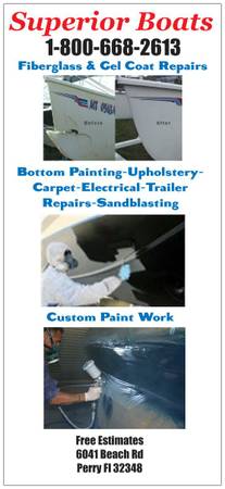 Transoms, decks, boxes, live wells, seating, custom paint jobs, gelcoat restoring. Custom fiberglass coolers, upholstery, electrical wiring and repairs.
